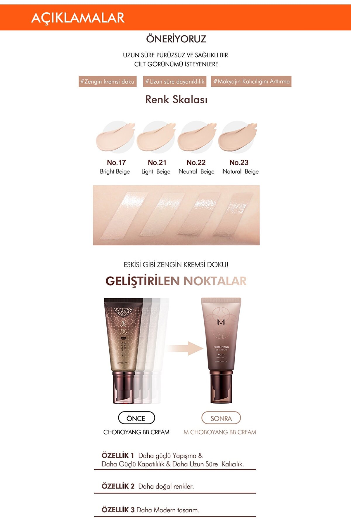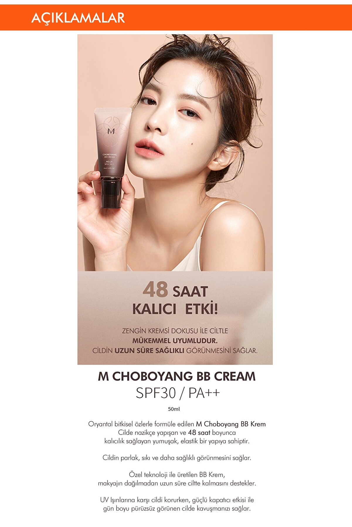 کرم BB ضد پیری با ترکیبات گیاهی شرقی است که به لطف قوام لثه ای که دارد پوست را سفت و شاداب می کند. اثر مراقبت از پوست و آرایش به مدت 12 ساعت از نظر بالینی ثابت شده است. دارای موادی است که مراقبت ضد پیری را ارائه می دهد. با پوشاندن لکه های روی پوست با خاصیت کانسیلر عالی خود ظاهری روشن و تمیز به پوست می بخشد. کرم بی بی با فرمولاسیون کامل پوشش ظاهری طبیعی در عین هماهنگی با رنگ پوست می بخشد. با داشتن SPF 30 از اثرات پیری ناشی از نور خورشید محافظت می کند.